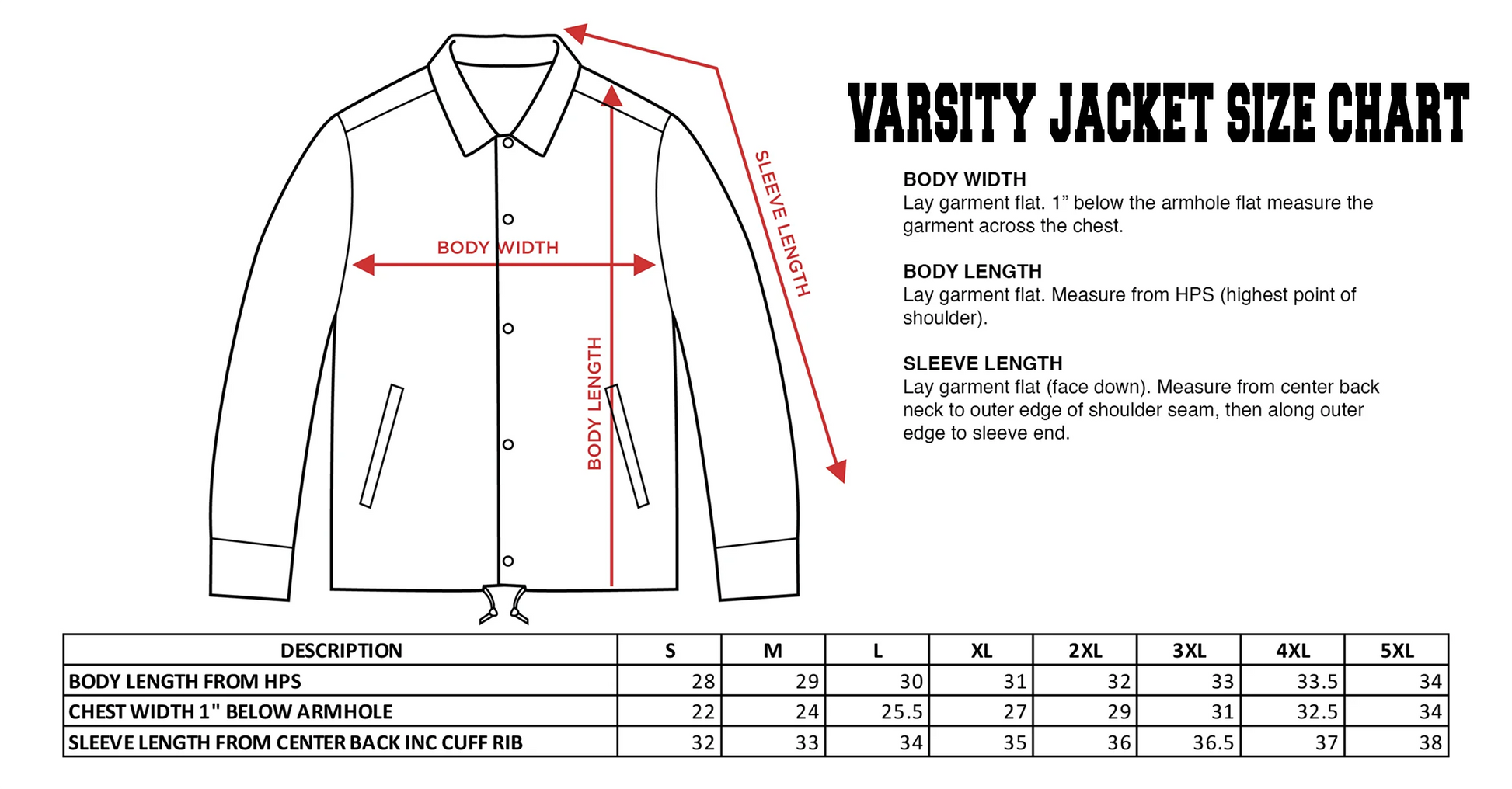 SIZE CHART: PLEASE REFER TO THE SIZE CHART BELOW AS THE JACKETS WERE MANUFACTURED BASED OFF OF THOSE MEASUREMENTS.